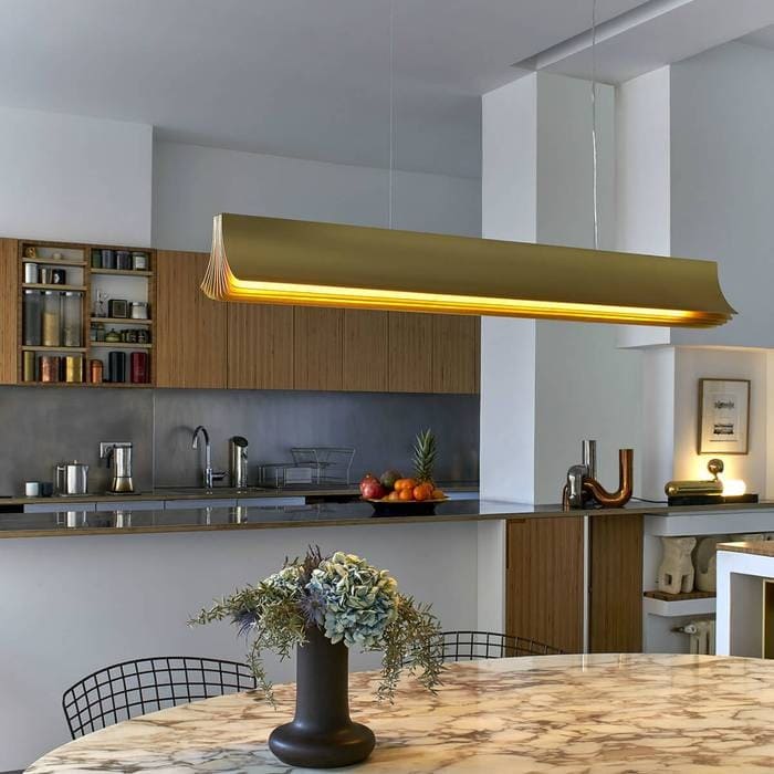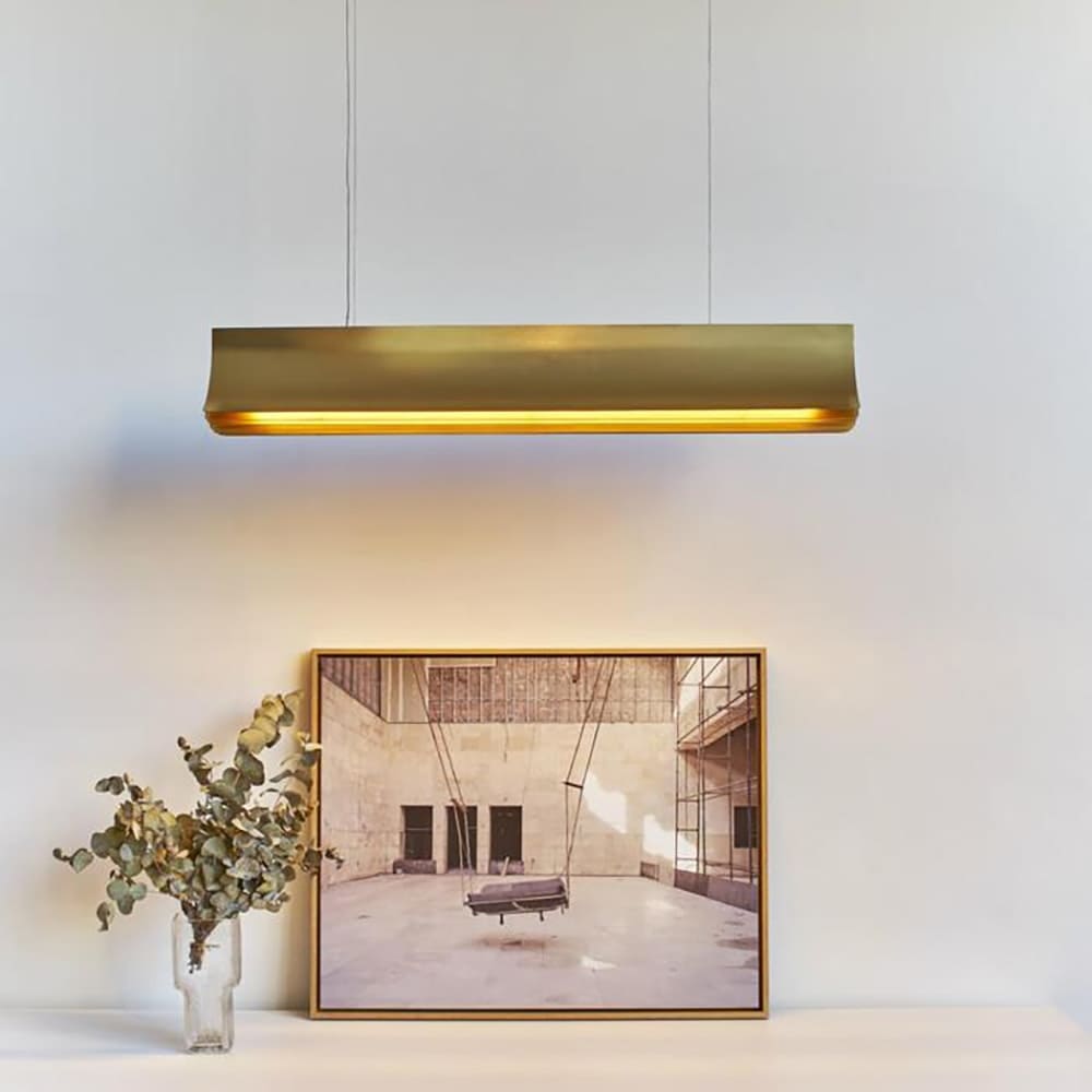 «Respiro», das italienische Wort für «Atem», verweist auf Leichtigkeit, Zartheit und den Wunsch nach Zweisamkeit, sei es mit Familie oder Freunden. Erhältlich in drei verschiedenen Größen (60 cm, 90 cm oder 120 cm) passt diese Pendelleuchte perfekt über ein Sofa oder einen Esstisch, unabhängig von der Größe des Tisches. Das warme und angenehme Licht entsteht durch das Reflektieren des Lichts an der goldenen Innenseite der Leuchte. Diese schafft eine behagliche Atmosphäre und eignet sich auch gut für den Einsatz im Büro oder in einem Restaurant.