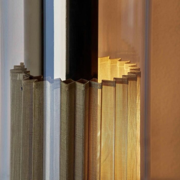 Entworfen von Dominique Perrault und Gaëlle Lauriot-Prévost ist die Wandleuchte IN THE TUBE 120-1300 weit mehr als nur eine Lichtquelle. Die Borosilikatglasröhren werden durch schwarze Aluminiumstopfen verschlossen, mit Silikon überzogen und mit einem Edelstahlring befestigt. Zwei plissierte Netze, in Gold oder Silber erhältlich, umhüllen die Glühlampen im Inneren der Röhre und erzeugen eine blendfreie Beleuchtung von außergewöhnlicher Qualität.