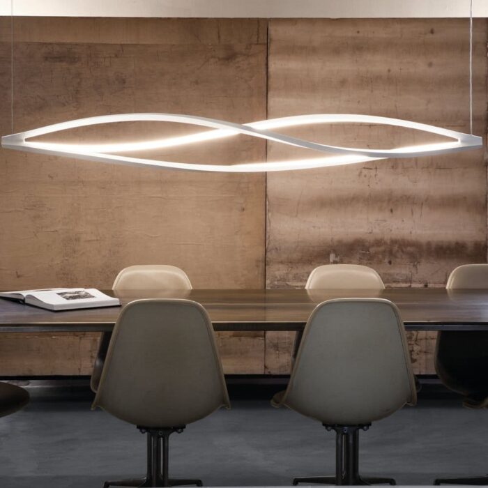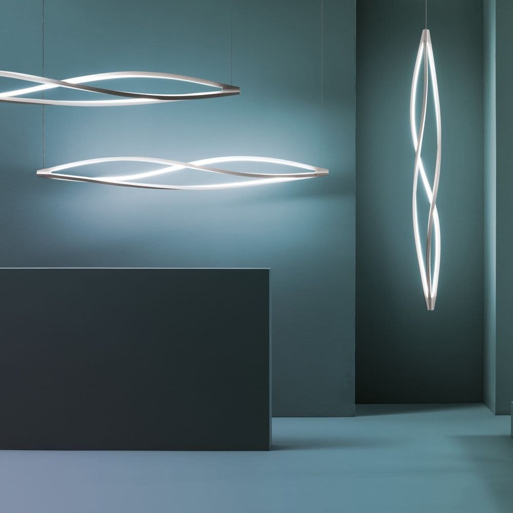 Arihiro Miyake, ein junger japanischer Designer, entwarf die In The Wind Horizontal Pendelleuchte für den italienischen Traditionshersteller Nemohting. Lig Gefertigt aus gedrehten Aluminiumprofilen überzeugen sie durch ihr fließendes, außergewöhnliches Design. Das Licht der LEDs wird durch opalweiße Kunststoffdiffusoren weich gebrochen und es wird eine allseitige Lichtausstrahlung erzielt.