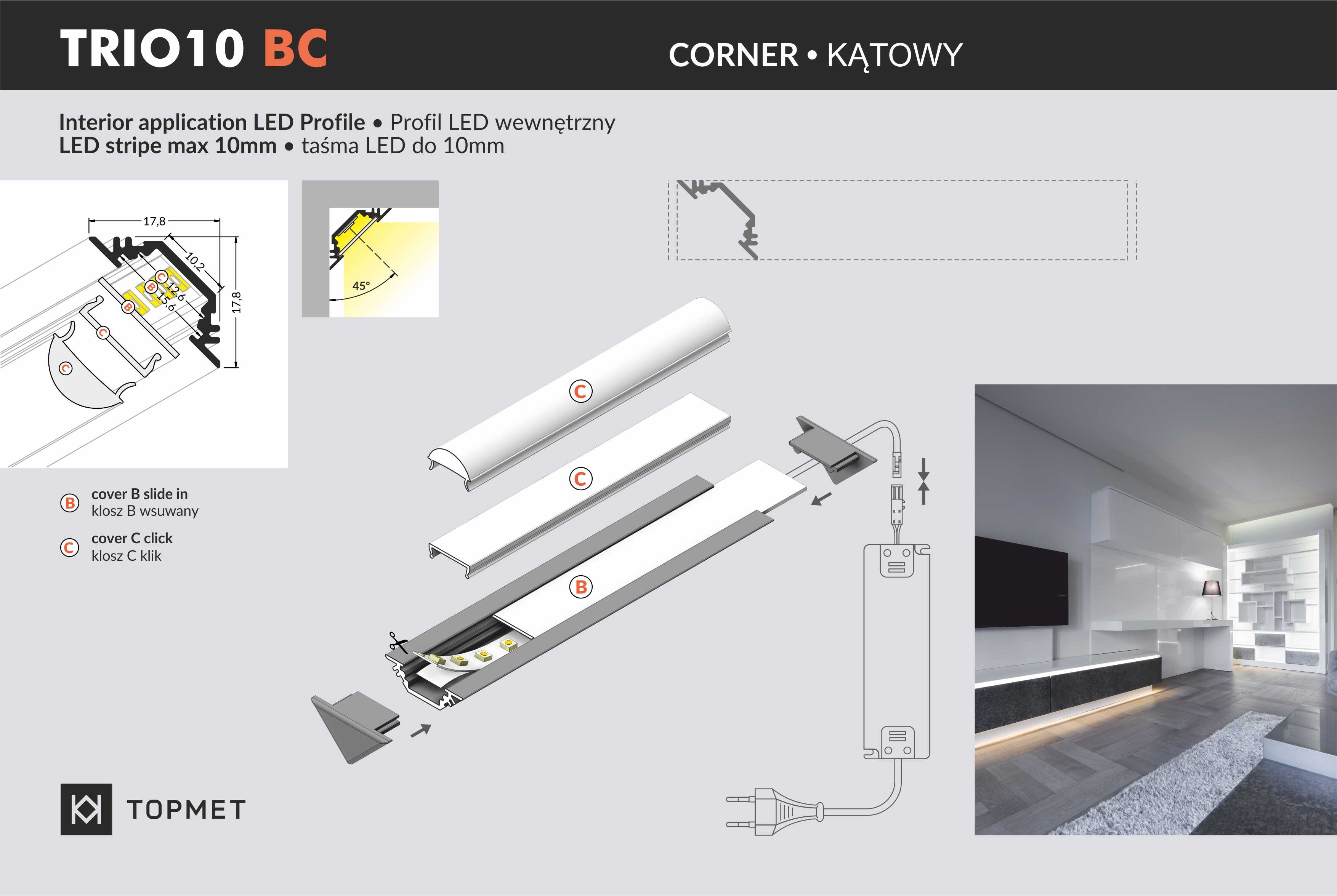 Notre profile LED TRIO10 peut être utilisé pour des rubans LED de différentes largeurs et est disponible en longueurs de 200 cm et 100 cm. C’est un profil étroit et très discret pour l’éclairage indirect.