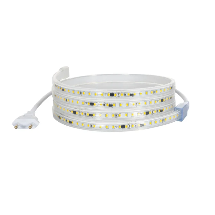 Le Ruban LED Dimmable 220V AC Solid 120LED/m Blanc neutre sur mesure Largeur 14mm coupe tous les 10cm IP65 ne nécessite aucun type de rectificateur car elle se branche directement au secteur. Sa flexibilité lui permet de s’adapter à presque toutes les surfaces.